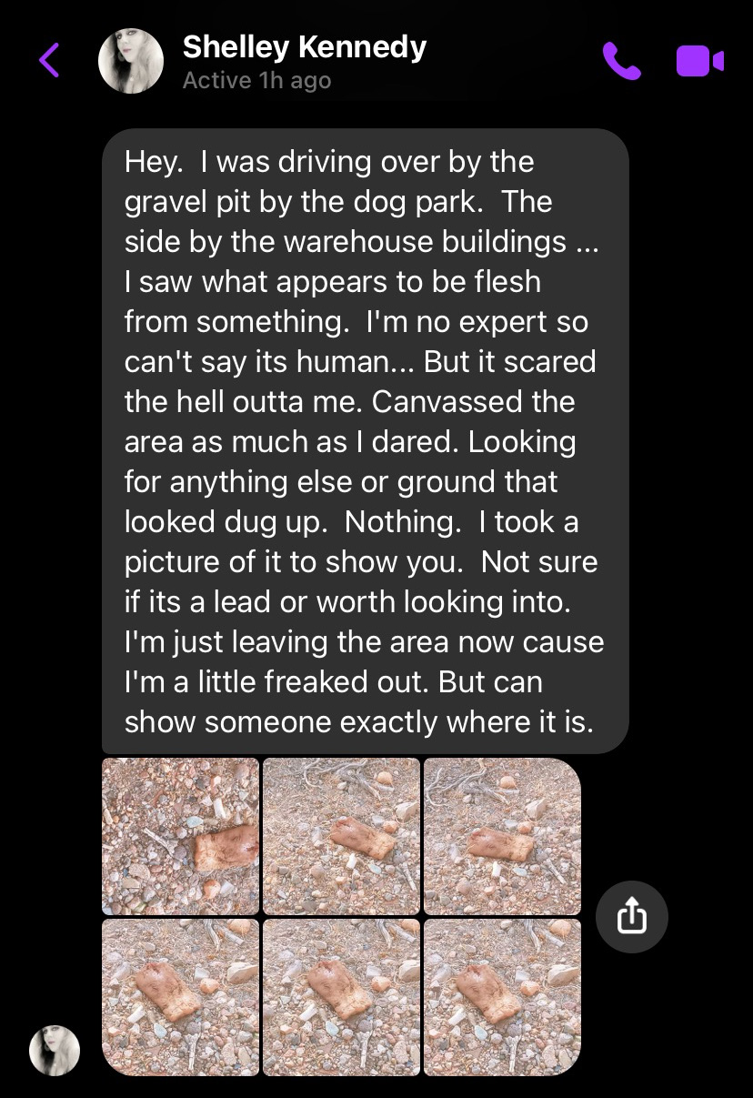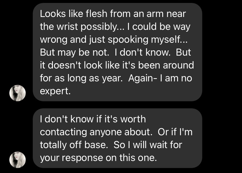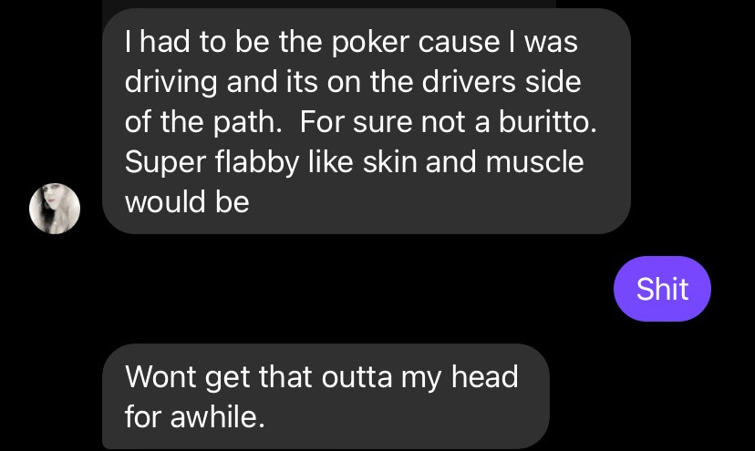 As some time passes, and she contacts LCSO about the mystery object, we pondered on what it could be. Possibly an old burrito? Some stick-poking was in order. Since I was still trying to get mobilized, and she was there on scene, the brave Shelley proceeded to poke.